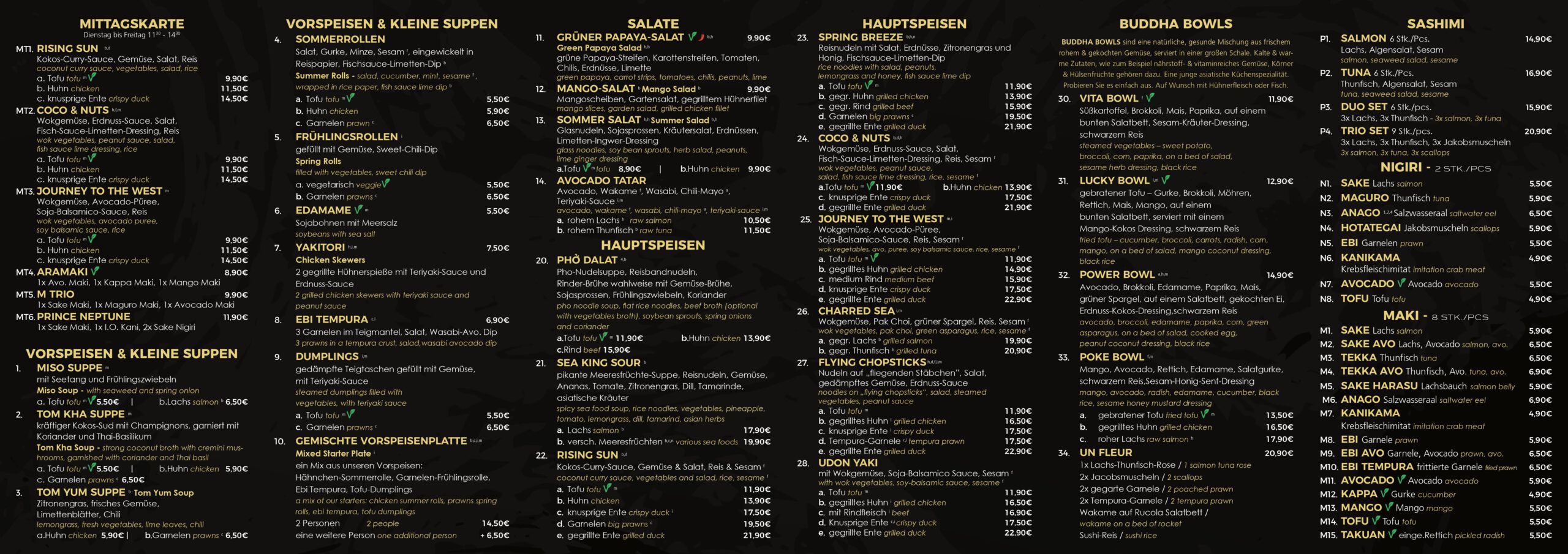 Unsere Speisekarte bietet für jeden Geschmack das Richtige. Ob Sie ein Liebhaber klassischer Sushi-Kreationen sind, sich nach einer würzigen asiatischen Suppe sehnen oder die Vielfalt unserer asiatischen Fusion-Gerichte entdecken möchten – bei uns bleiben keine kulinarischen Wünsche offen. Wir legen großen Wert auf höchste Qualität und authentische Zubereitung, damit jedes Gericht zu einem besonderen Erlebnis wird.